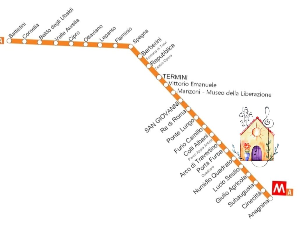 Explore our apartment well positioned in the city map. Casa di Sol is in the south-east of Rome at about 100 meter from the Aqueduct Park and 500 meters from the Line A of Rome subway (Lucio Sestio station). By means of Line A, it takes about 20 minutes to reach the centre of Rome (e.g. Piazza di Spagna) and 25 minutes the Vatican City.